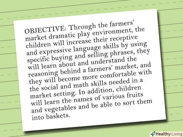 Почніть з одного або більше завдань і створіть план уроку, націлений на те, що ваші учні повинні знати або вміти робити після того, як план уроку буде реалізований.приклади включають в себе: навчитися розрізняти геометричні фігури, навчитися писати букву «А», навчитися самостійно застібати сорочку.