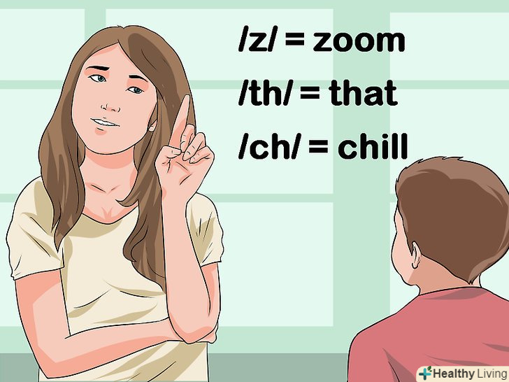 - Не судіть строго те, як дитина вимовляє звуки. Сприйняття на слух у дитини розвинене ще не так добре, до того ж він може чути місцевий говір в дитячому садку або у дворі, тому не чекайте від нього академічно точної вимови. Докладайте розумних зусиль. Зрозумійте, що розучування звуків-це всього лише проміжний етап на початку навчання читання, а не мета.[6]