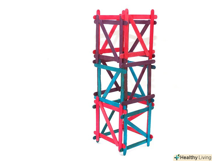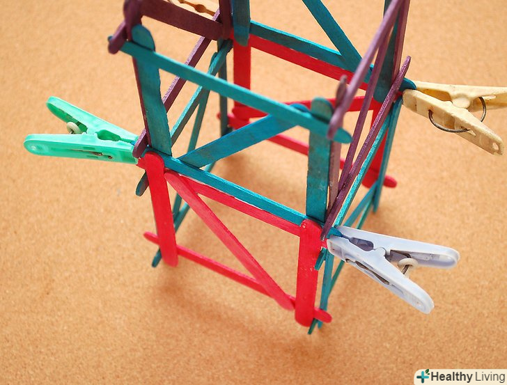 Як тільки будуть побудовані 2 куба, вони можуть бути складені один на одного і з'єднані разом за допомогою нанесення клею в місцях зіткнення паличок.затисніть Нижні з'єднання за допомогою білизняних прищіпок і дайте час, щоб висохнути.