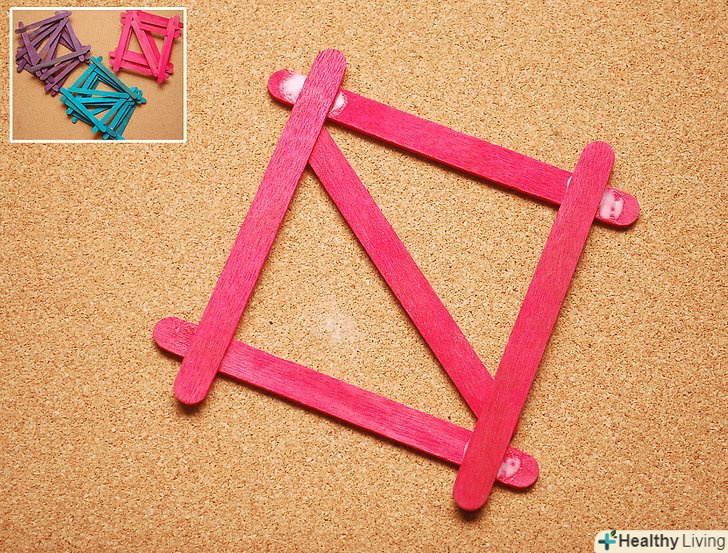 - Розкладіть палички 2 по 2 (2 палички на кожній стороні) зліва, і 2 палички справа. Покладіть поперечну паличку і додайте мазок клею тільки на внутрішню паличку. Приберіть найдальшу паличку до того як клей засохне. Залишилася (проклеєна) паличка є шириною палички від кінця перетинає палички.