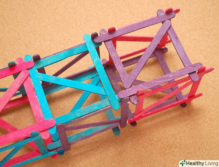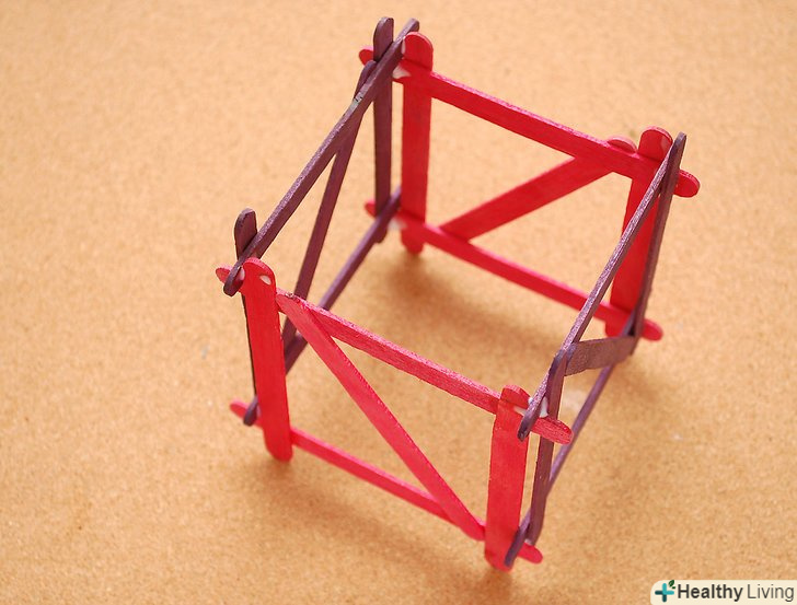 З'єднайте два квадратаз протилежними перемичками,Щоб сформувати куб. більше паличок знадобиться «зв'язати» квадрати в куб. спочатку дві нижні палички проклеюють, тримають під вантажем і дають підсохнути, потім конструкцію перевертають і додають 2 палички, щоб зв'язати разом протилежні сторони куба.- Протилежні перемички означають, що квадрати з перемичкою у формі Z з'єднуються з квадратами форми S.