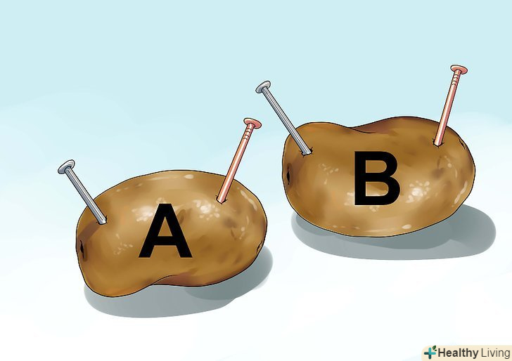 В протилежний край кожної картоплини застроміть по мідному цвяху так, щоб він не торкався хромованого.