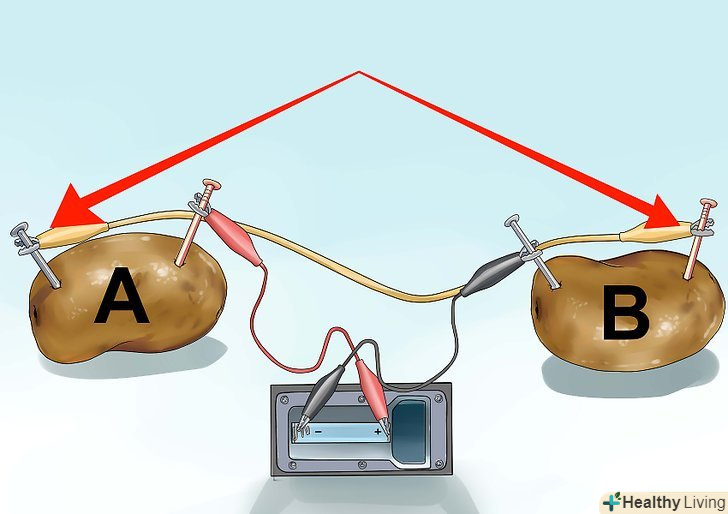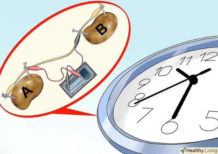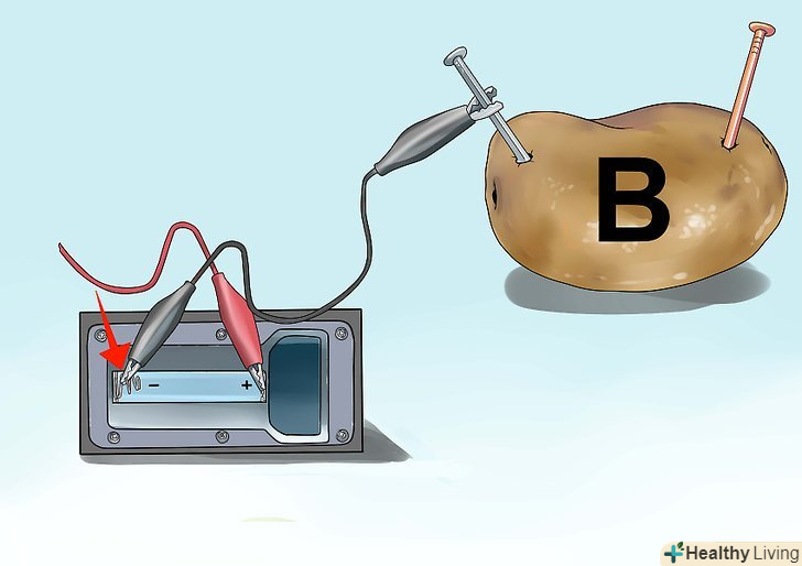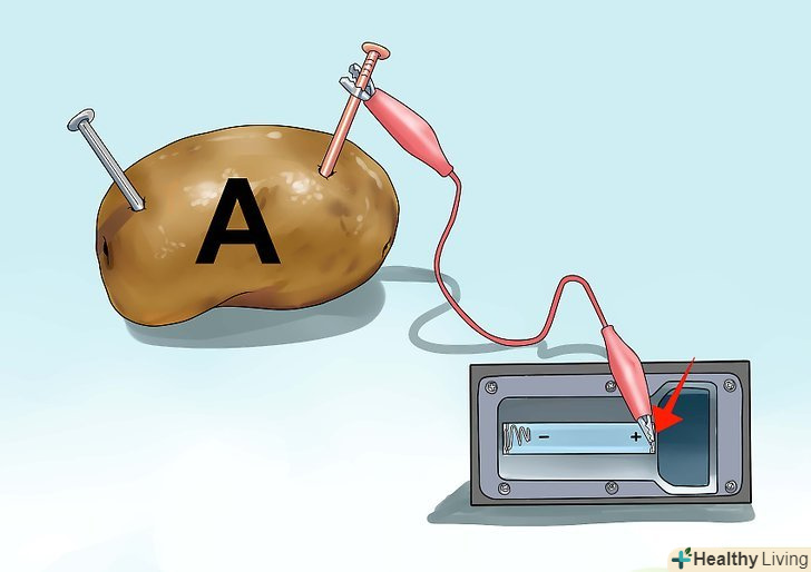 З'єднайте першим проводом мідний цвях картоплини "A" з позитивним (+) полюсом годин.