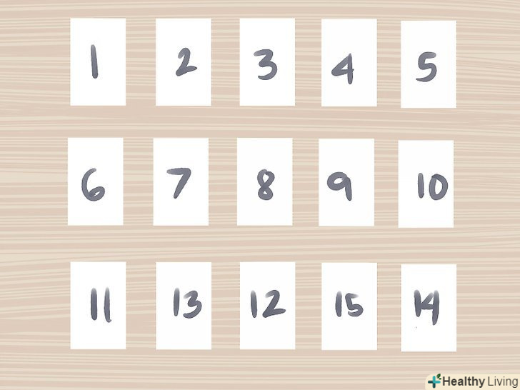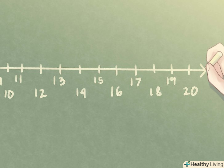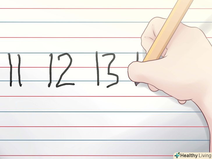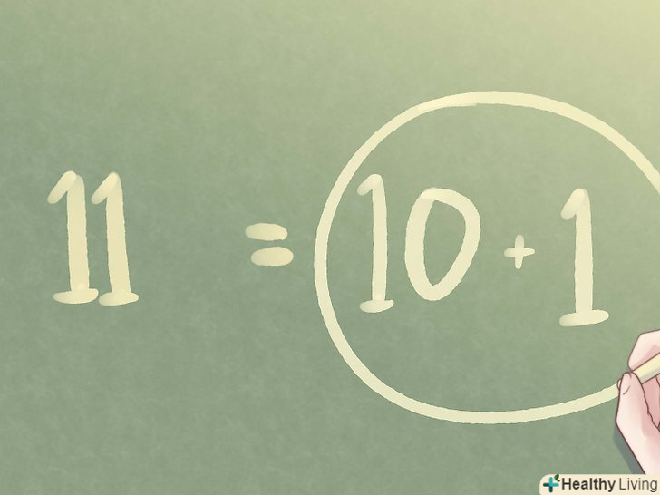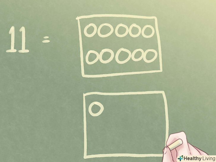 Познайомте дітей з кожним окремим числом.починаючи з 11, розкажіть дітям про кожне число окремо. Напишіть число на дошці і додайте візуальний приклад, наприклад, якщо ви пишете число 11, намалюйте 11 кольорів, 11 машин або 11 осіб з посмішкою.- Це також допоможе дітям можуть зрозуміти концепцію десятків. У другій частині даної статті десятки описані більш детально.