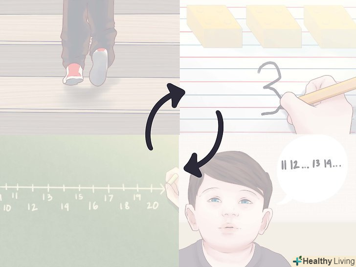 Вважаємо за допомогою фізичних вправ.Навчіть дітей рахувати свої кроки (для цієї вправи дуже підійдуть сходи, але вистачає і того, якщо вони просто пройдуть від одного кінця кімнати до іншого). Можна сказати їм, щоб стрибали 20 разів, заодно вважаючи кількість стрибків.- Дуже підійде гра в класики. Накресліть на землі 10 квадратиків (класів) і пронумеруйте кожен, написавши на ньому число від 1 до 10. Дайте дітям завдання рахувати, стрибаючи на кожен квадратик і так до 10, повертаючись же назад, їм слід порахувати від 11 до 20.