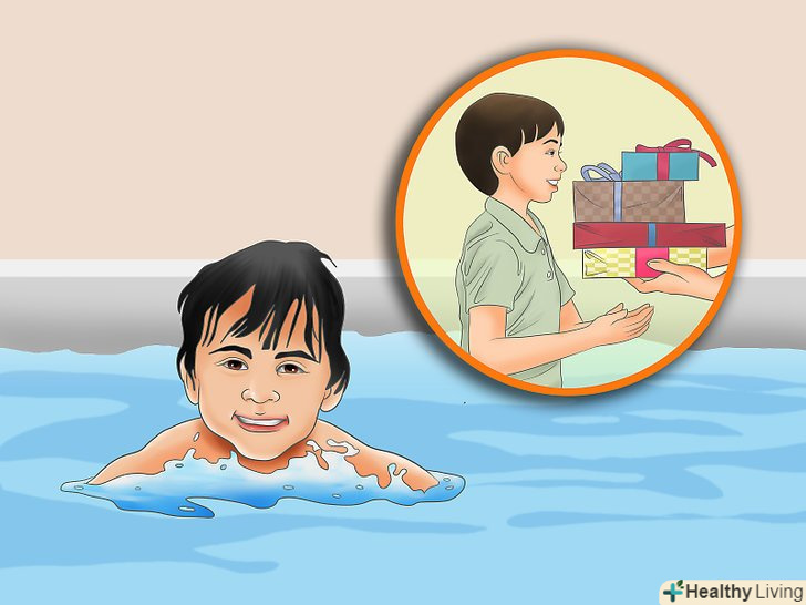 Поговоріть з дитиною про плавання.використовуйте історії з життя і розповіді, щоб поговорити з дитиною про навчання плаванню і про те, чого можна очікувати від таких уроків. Подібні історії є ефективним засобом, який дозволяє дитині звикнутися з ідеєю занять плаванням.[5]- Можна підібрати відповідні книги з розповідями в бібліотеці або пошукати в мережі приклади реальних історій, які можна адаптувати для вашої дитини, або навіть написати свою власну історію.