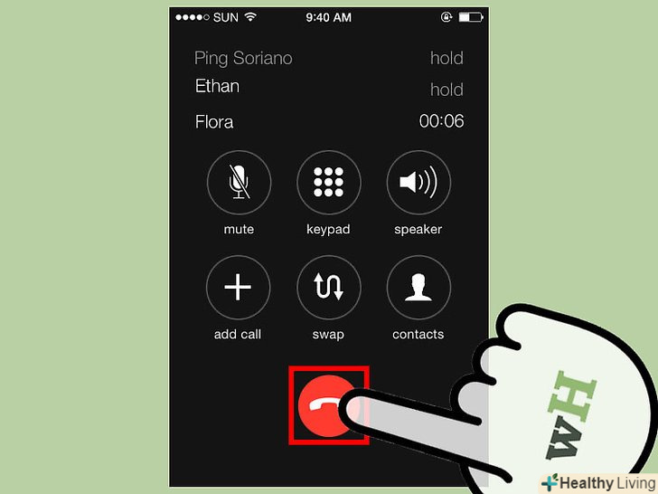 Натисніть "Завершити", щоб завершити телефонну конференцію.- Інші абоненти можуть покинути конференцію в будь-який час. Так як не вони були організаторами конференц-дзвінка, їх відхід його не завершить.[15]