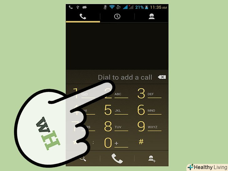 Натисніть "Додати виклик".у вас буде доступ до списку контактів і набору з клавіатури. Ця іконка може мати наступний вигляд: малюнок людини зі значком «+» або великий «+» зі словами «додати виклик».[10]