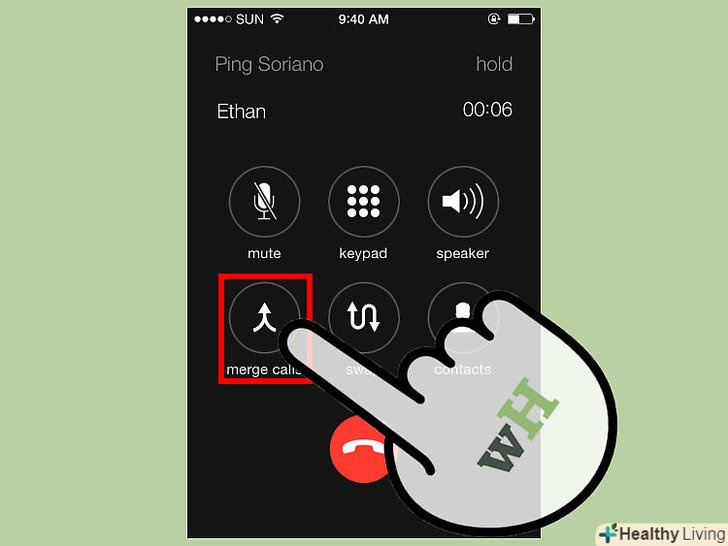 Натисніть "З'єднати" або»Об'єднати дзвінки".це дозволить об'єднати обидва дзвінки в одну конференц-зв'язок.[12]