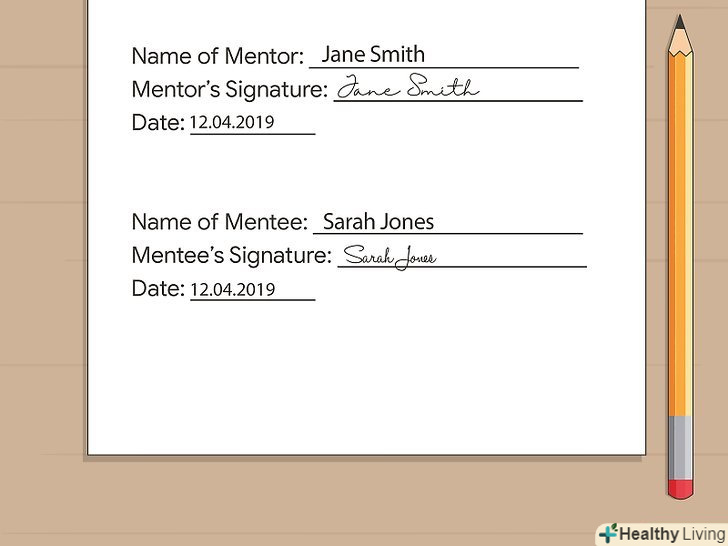 Разом перегляньте план і підпишіть.як тільки ви та ваш куратор задоволені новим або переглянутим планом, ви обидва можете підписати його для офіційного закріплення. Переконайтеся, що ви обидва згодні з цілями та іншими завданнями, викладеними в плані, і внесіть необхідні зміни, перш ніж його підписувати.[13]Порада: зробіть копії плану, щоб у вас і вашого куратора / учня була така копія, і роздайте її всім, хто може захотіти її переглянути, наприклад керівнику відділу або менеджеру з персоналу.