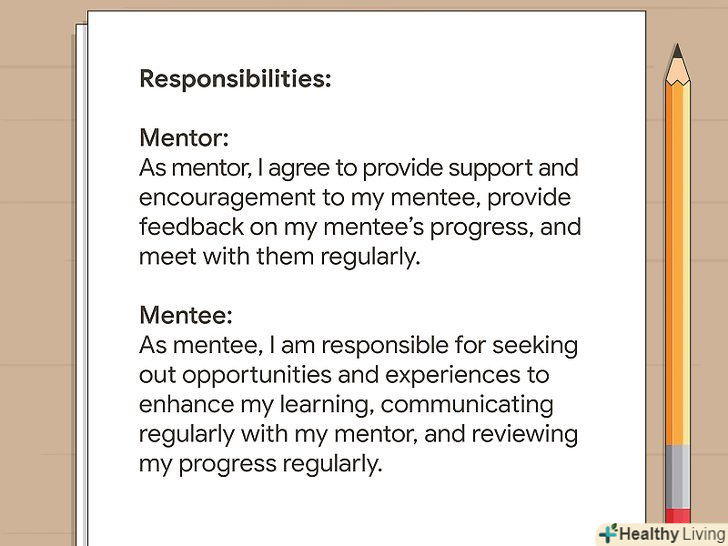Визначте обов'язки кожного з вас.після того як ви визначите деякі цілі, з'ясуйте, що саме буде потрібно від куратора і учня для їх досягнення. Чітко сформулюйте ці обов'язки, щоб не помилитися в ролі кожного з вас.[4]- Наприклад, якщо ви є учнем, то можна написати щось на кшталт: «як учень, я відповідаю за пошук можливостей отримати досвід для вдосконалення процесу мого навчання, постійно спілкуючись з моїм куратором і регулярно аналізуючи свої успіхи».