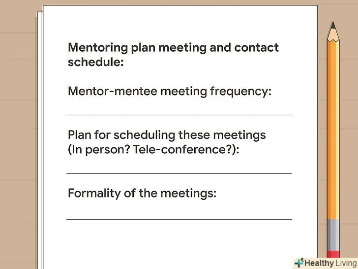 Вкажіть, як часто ви і ваш куратор/учень будете зустрічатися.намагайтеся зустрічатися зі своїм куратором / учнем 3-4 рази за півроку або частіше, якщо хочете. Більш часті зустрічі можуть сприяти гарному прогресу, особливо в перші рік-два ваших відносин. До інших питань, які слід враховувати при плануванні зустрічей, відносяться наступні:[5]- Де ви будете зустрічатися;
