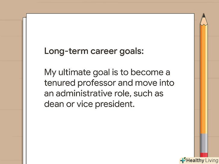 Запишіть довгострокові кар'єрні цілі учня.визначення кінцевої або основної кар'єрної мети учня допоможе вам створити чіткі цілі для роботи. Якщо ви-учень, обговоріть свої кар'єрні цілі з куратором, а потім вкажіть вашу кар'єрну мету в якості основного завдання плану наставництва. Якщо ви куратор, обговоріть з учнем його кар'єрні цілі, нехай він викладе свої ідеї, а потім на їх основі допоможіть йому сформулювати остаточну тезу.[6]- Наприклад, ви можете написати щось на кшталт:»Моя кінцева мета — стати професором кафедри і зайняти адміністративну посаду, наприклад декана або проректора".