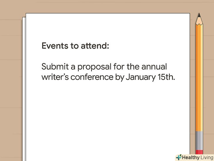 Визначте заходи з підвищення кваліфікації, які повинен відвідати той, хто навчається.включіть в план семінари, конференції або інші заходи з підвищення кваліфікації, які можуть принести користь навченому. Також вкажіть, коли проводяться заходи і які важливі терміни повинні бути відомі того, хто навчається, наприклад крайній термін подання доповіді на конференцію.[9]- Наприклад, ви можете включити в план наставництва такий пункт « " подати заявку на щорічну письменницьку конференцію до 15 Січня».