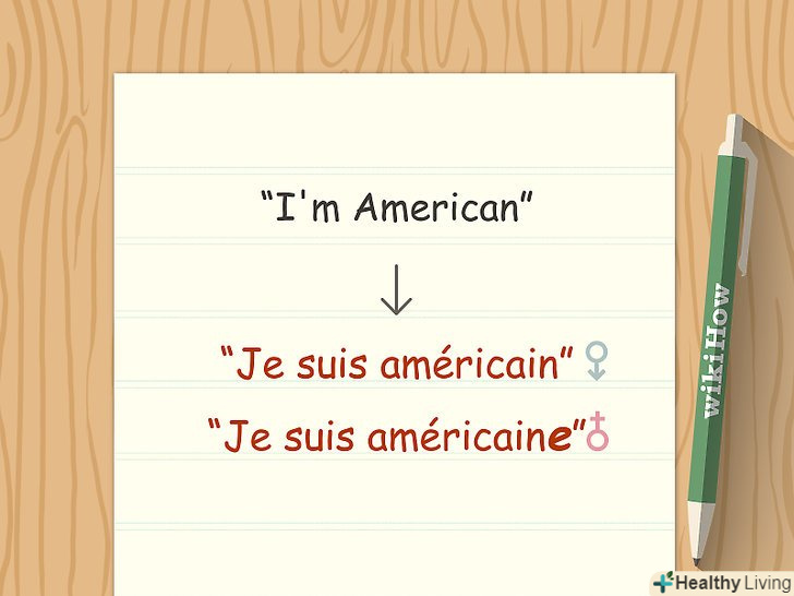 Запам'ятовуйте рід слів. як і в російській, у французькій мові всі іменники і прикметники відносяться до чоловічого або жіночого роду. Багато слів із закінченням " e " відносяться до жіночого роду, але важливо пам'ятати, що існує багато винятків! В першу чергу слід запам'ятати, що рід прикметника повинен відповідати роду іменника.[12]- До того ж, якщо іменник стоїть у множині, то описує його прикметник теж має бути у множині. Використовуйте фразу "Sam est petit" (сам Е Петі), щоб сказати, що хлопчик Сам невисокого зросту. Якщо дівчатка з іменами Сам і Бет обидві низькорослі, то скажіть «Sam et Beth sont petites» (сам і Бет сон Петіт).