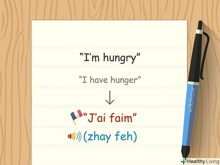 Навчіться використовувати допоміжні дієслова.Правильно використовувати дієслова "être «(бути) і» avoir" (мати) не завжди просто, але це важливий базовий аспект французької мови. У французькому допоміжні дієслова потрібні у фразах на кшталт» Я голодний «і»я хочу пити". Наприклад, "J'ai faim «(же ФЕМ) і» J'ai soif «(же суаф) дослівно перекладається як» у мене є голод «і»у мене є спрага".[13]- Щоб дізнатися, чи голодна людина, задайте питання " Avez-vous faim?"(Аве Ву ФЕМ) або " As-tu faim?"(а тю ФЕМ). Замініть "faim «на» soif «(суаф), щоб запитати про спрагу, або на» sommeil" (сомей), щоб дізнатися, чи хоче людина спати.
