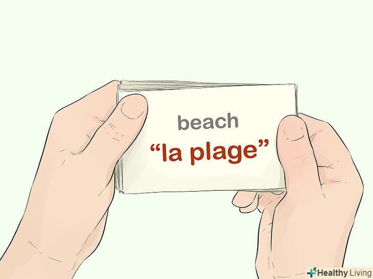 Складайте флеш-картки для розширення словникового запасу. з одного боку напишіть французьке слово,а з іншого переклад. Під час запису вимовляєте слова вголос. Перевіряйте себе або працюйте з друзями.[15]- Якщо бачити, записувати і вимовляти переклад вголос, тоді слова краще відкладуться в пам'яті.[16]