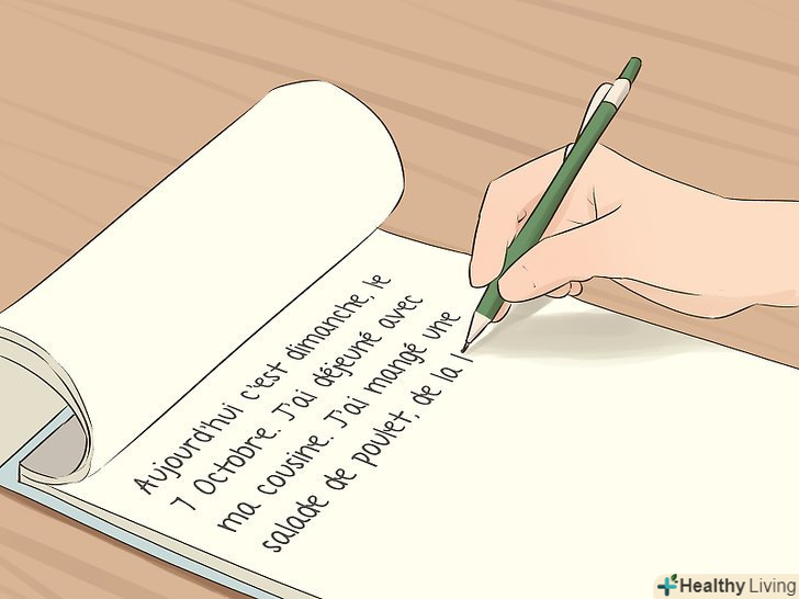 Описуйте свій день у щоденнику французькою мовою.коли освоїте основи мови, тренуйтеся щодня писати короткі речення. Вони не повинні бути складними, особливо спочатку. Для закріплення використовуйте слова з щоденних і щотижневих списків.[19]- Наприклад, можна написати: "Aujourd'hui c'est dimanche, le 7 Octobre. J’ai déjeuné avec ma cousine. J’ai mangé une salade de poulet, de la laitue, des épinards, des oignons, et des tomates».
