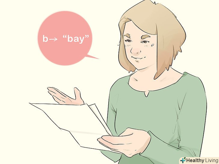 Тренуйтеся вимовляти буквиАлфавіту для розуміння французької фонетики. вимовляєте голосні a, e, i, o, u як «А», «Е», «і», «о» і «у». Приголосні начебто b і c вимовляються як «бе» і «се» на відміну від англійських букв «бі» і «Сі».[3]- Вимовляєте букви французького алфавіту: «а (a), Бе (b), се (c), де (d), е (e), Еф (f), ж (g), аш (h), і (i), жи (j), ка (k), Ель (l), ем (m), ен (n), о (o), ПЕ (p), ку (q), Ер (r), ЕС (s), те (t), ю (U), ве (V), дубль-ве (w), Ікс (x), ігрек, (y), ЗЕД (z)».