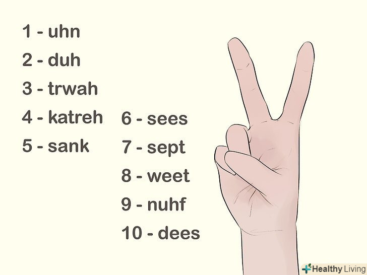 Навчіться рахувати по-французьки.цифри допоможуть вам зробити замовлення в ресторані або назвати свій вік. Розділіть завдання на кілька кроків, щоб швидко навчитися рахувати до 1000. У перший день тренуйтеся рахувати від 1 до 10, потім переходите від 11 до 20, а ще через день запам'ятайте інші десятки (30, 40, 50 і так далі).[4]- Цифри від 1 до 10 у французькій мові пишуться як «un, deux, trois, quatre, cinq, six, sept, huit, neuf, dix» і вимовляються «ен (1), де (2), труа (3), кятр (4), СЕНК (5), СІС (6), Сет (7), Віт (8), Неф (9), дис (10)».