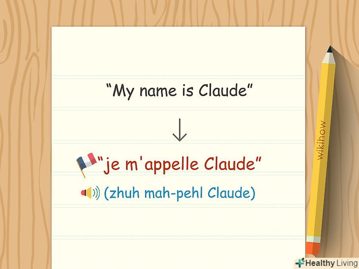 Вчіться розповідати про себе.Вчіться називати своє ім'я, вік, країну проживання і задавати людям подібні питання. Щоб представитися, скажіть "Je m'appelle «(же мапель), що означає»Мене звуть".[9]- Щоб дізнатися ім'я людини, запитайте " Comment vous appelez-vous?"(Коман Ву запле ву) для ввічливого поводження або " Comment tu t'appelles?"(коман тю тапель) в менш формальній обстановці.