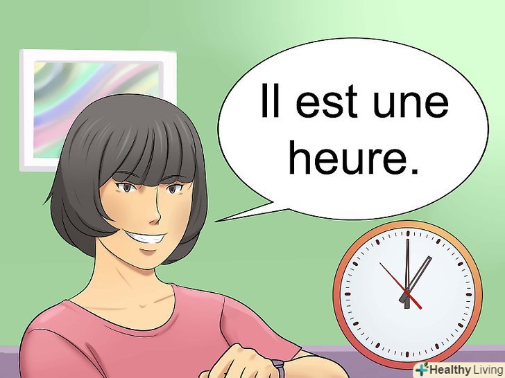 Використовуйте "Il est__ _ _ _ _ heure", щоб назвати час. щоб сказати " зараз годину (дня чи ночі)», ви скажете «Il est une heure» (Іль ет 'юн 'ер). У російській мові ми можемо опускати кілька слів і відповідати коротко, наприклад «три» замість «три години», у французькому завжди додається «heure» після цифри.[3]- Якщо часу більше, ніж годину, використовуйте множину. Наприклад, дві години - " deux heureS» (де зер), а п'ять годин — «cinq heureS» (сан: кер). Це важливо пам'ятати на листі, а на слух єдине і множина звучать однаково.[4]