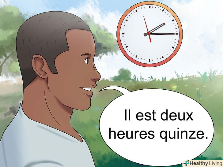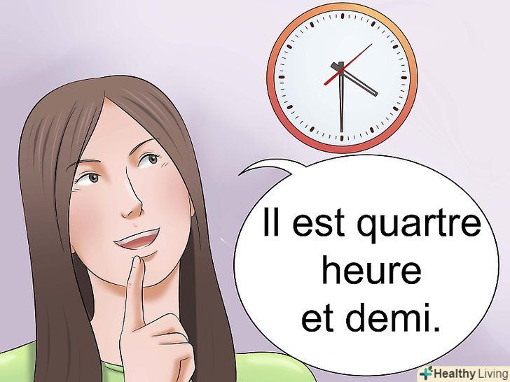 Вивчіть короткі позначення половини і чверті години.як і в російській мові, у французькій можна сказати» половина «або» чверть", кажучи про час. Половина буде «demie» (Демі), а чверть — «quart» (кяр). У французькому замість «половина/чверть такого-то» говорять «стільки-то годин і половина/чверть», так що ці слова можна додавати після «heure(s)», використовуючи союз «et» (Е), що означає «І». Наприклад, 4: 30 по-французьки буде «Il est quatre heures et demie» (Іль е кятр 'ер е Демі), тобто «чотири години і половина».[6]- Як і в російській мові, обидва варіанти правильні-і «4:15», і «4 з чвертю». Це просто два способи сказати одне і те ж.