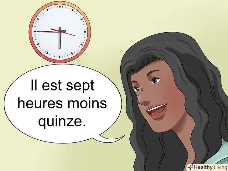 Використовуйте "moins«, щоб сказати»без стількох-то хвилин".по-російськи ми можемо сказати, що 6:45 — це без чверті сім, а 12: 50-без десяти год. У французькій мові для цього вживається слово "moins«, що і означає» без «або»мінус". Тому, якщо зараз 6:45, ми можемо сказати: «Il est sept heures moins le quart» (Іль е се тер Муен: ле кяр) або «Il est sept heures moins quart» (без «le»), що буквально перекладається як «без чверті сім».[7]- Багато франкомовні люди швидше скажуть час таким чином, ніж будуть використовувати великі числівники на зразок 45 до 50.