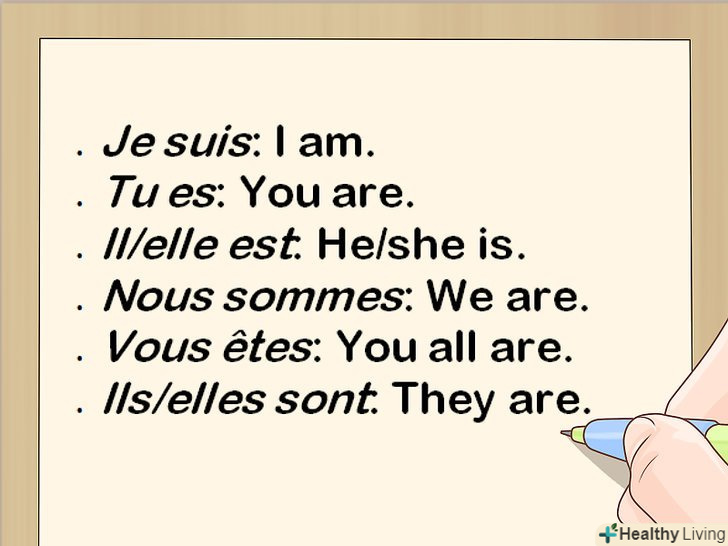 Проспрягайте дієсловоêtre в теперішньому часі. використовуйте ту форму дієслова être, яка відповідає особі і числу підмета. Це неправильний дієслово, тому запам'ятайте, як він відмінюється.[11]- Je suis: я є.