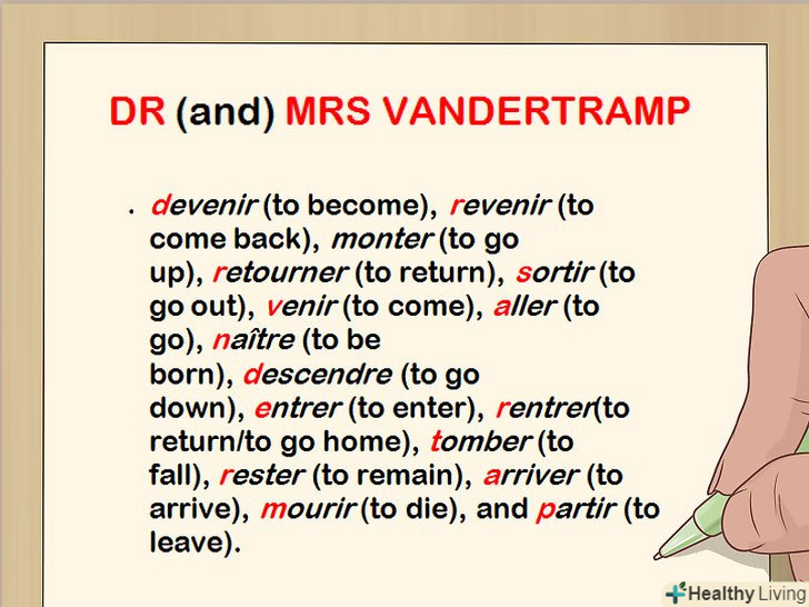 Спробуйте запам'ятати дієслова, з якими слід використовувати допоміжний дієсловоêtre, за допомогою мнемонічного правила. крім зворотних, у французькій мові є і деякі інші дієслова, з якими використовується допоміжний дієслово être в passé composé. Ці дієслова можна запам'ятати за допомогою наступного мнемонічного правила"DR (і) MRS VANDERTRAMP".[14]- Вхідні в дане правило букви відповідають початковим буквам наступних дієслів:devenir (ставати), revenir (повертатися), monter (підніматися), retourner (перевертати), sortir (виходити), venir (приходити), aller (йти), naître (народжуватися), descendre (спускатися), entrer (входити), rentrer (повертатися/повернутися додому), tomber (падати), rester (залишатися), arriver (прибувати), mourir (вмирати) і partir (залишати).