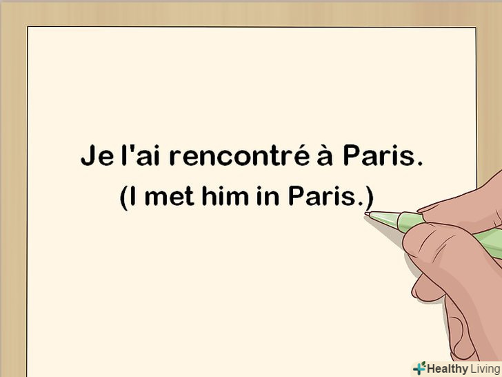 Помістіть особистий займенник між підметом і допоміжним дієсловом. у французькій мові особистий займенник зазвичай стоїть перед відповідним дієсловом. Якщо ви використовуєте складний час, як passé composé, особистий займенник повинен передувати допоміжному дієслову.[16]- Наприклад: "Je l ai rencontré à Paris" (я зустрів його в Парижі).