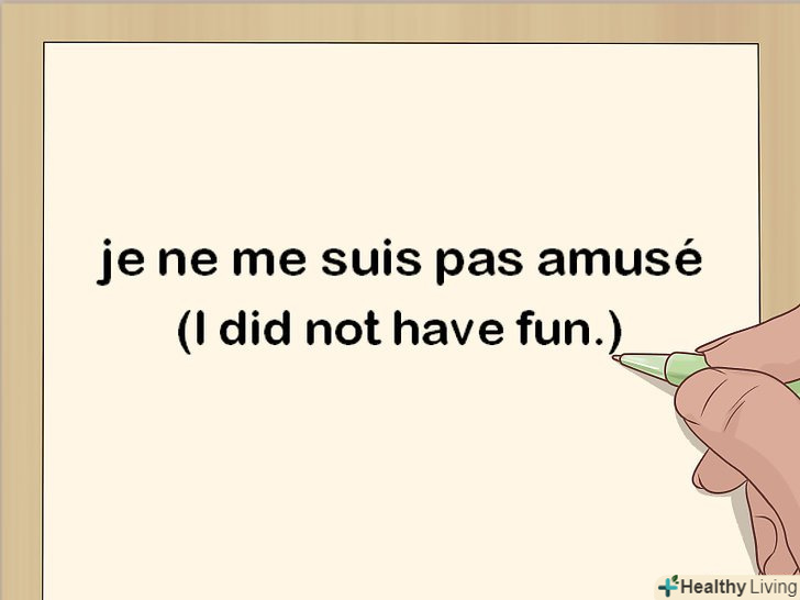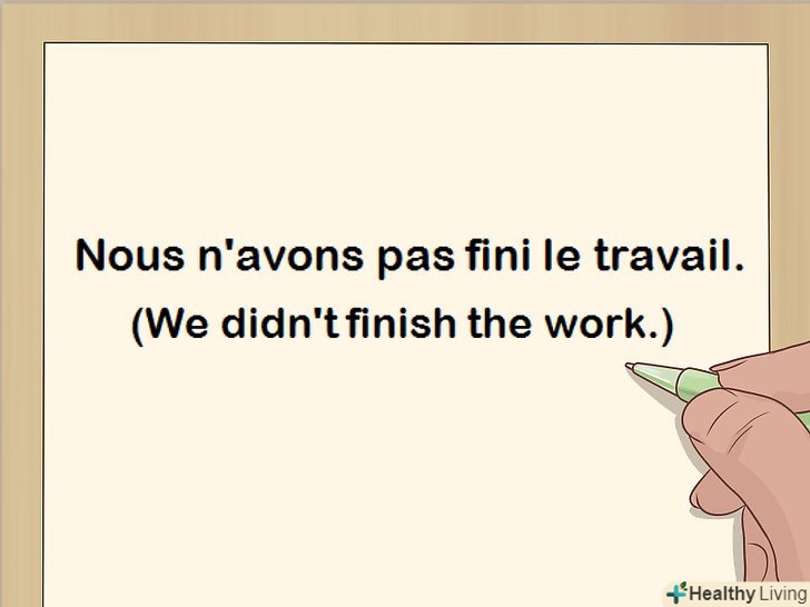 Утворіть негативну форму навколо допоміжного дієслова.якщо ви хочете використовувати час passé composé для того, щоб сказати, що якась дія не відбувалося в минулому, будьте уважні і не ставте в негативну форму причастя минулого часу. Просто поставте" ne... pas " навколо допоміжного дієслова — у наведеному нижче прикладі це дієслово avoir.[18]- Наприклад: "Nous n'avons pas fini le travail" (ми не закінчили роботу).