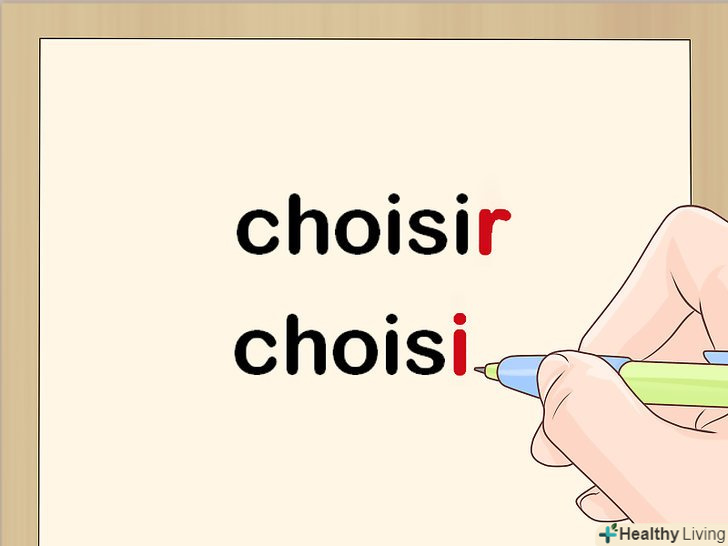 Якщо дієслово закінчується на-ir, приберіть r. якщо правильний дієслово має закінчення - ir, не слід прибирати його повністю. В цьому випадку досить прибрати одну букву r, щоб дієслово мав закінчення i. Наприклад, дієслово choisir (вибирати) має причастя минулого часу choisi.[3]