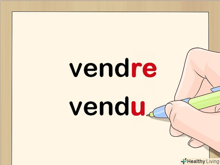 Замініть закінчення-re наu . якщо правильний дієслово закінчується на - re, просто приберіть це закінчення і замініть його на u. Наприклад, дієслово vendre (продавати) має причастя минулого часу vendu.[4]