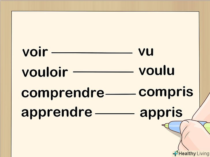 Запам'ятайте неправильні дієслова.подібно до багатьох інших мов, французька мова має ряд неправильних дієслів. Ці дієслова можуть мати закінчення, схожі з закінченнями правильних дієслів, але відмінюються вони по-іншому. Причастя минулого часу цих дієслів також не підкоряються правилам, використовуваним для правильних дієслів, тому їх доведеться вивчити.[5]- У деяких випадках можна керуватися певними правилами. Наприклад, для більшості неправильних дієслів із закінченням - oir причастя минулого часу закінчуються на u. Так, дієслово " voir "(бачити) має минулу форму" vu", а дієслово" vouloir "(хотіти, бажати) — "voulu".