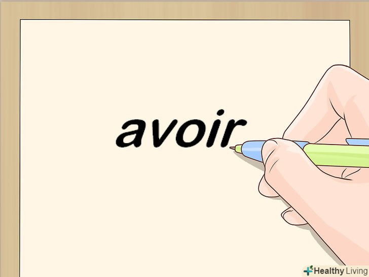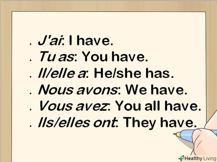 Проспрягайте дієсловоavoir в теперішньому часі. неправильний дієсловоavoir часто використовується у французькій мові. Якщо ви ще цього не зробили, просто вивчіть, як діє цей дієслово, оскільки він часто використовується, у тому числі для формування часу Passé composé.[7]- J ai: я маю.