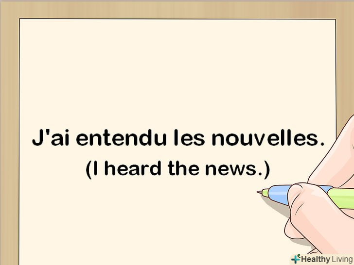 З'єднайте дієсловоavoir з правильною формою причастя минулого часу. Passé composé є складним минулим часом. Допоміжний дієсловоavoir показує, коли відбувалося дію (в минулому). Основний дієслово в минулій формі вказує, яка дія відбувалося.[8]- Наприклад: "J'ai entendu les nouvelles "(я чув новини).