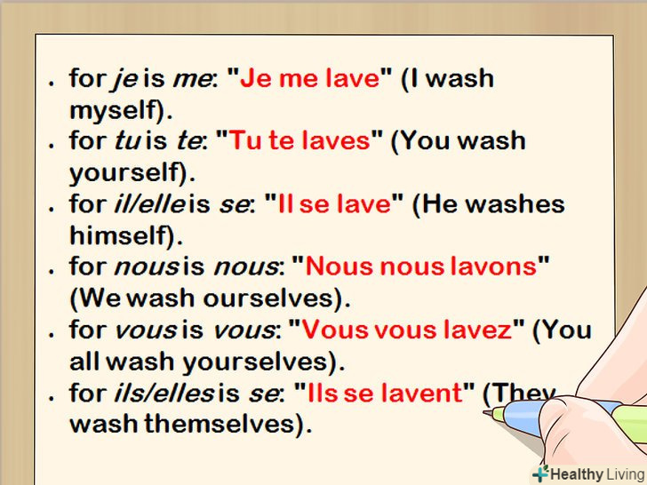 Додайте відповідний зворотний займенник.зворотне займенник повинен відповідати підлягає. Запам'ятайте правильні форми зворотних займенників для всіх особистих займенників.[10]- Зворотним займенником дляje є me:" Je me lave " (я вмиваюся).