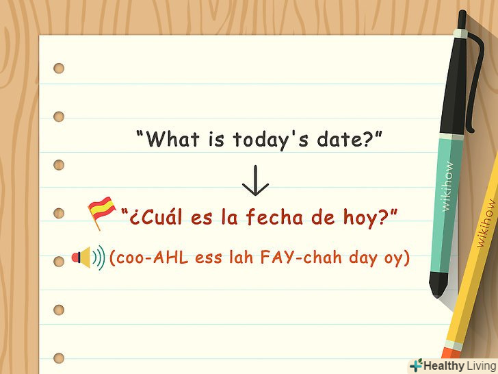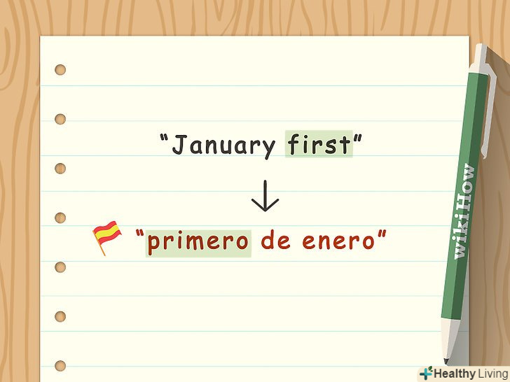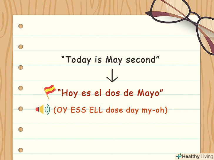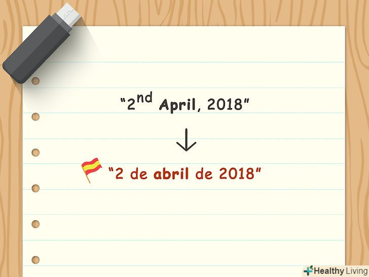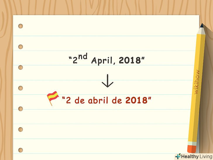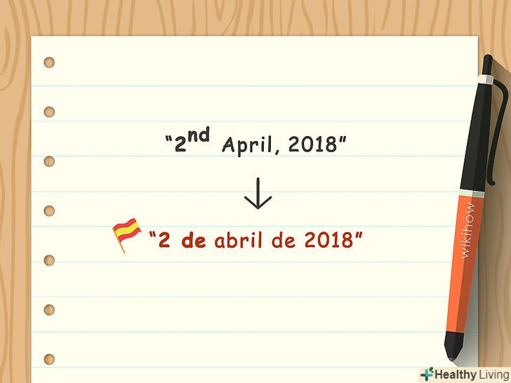 Для російськомовних людей написання або вимова дати іспанською мовою не складе великих труднощів, так як в обох мовах спочатку йде день, а потім місяць. Більш того, і там, і там існує тільки один спосіб назвати дату. Щоб зробити це іспанською мовою, почніть зel, потім вкажіть число, відповідне дню, а потім назву місяця.[1]