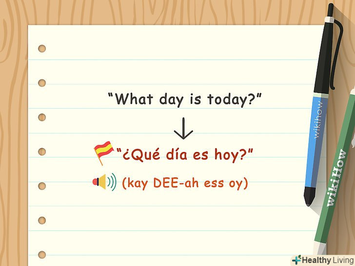 Запитайте, який зараз день тижня. якщо ви хочете дізнатися, який зараз день тижня, ви, швидше за все, запитаєте: ¿Qué día es hoy? (КЕ Ді-а ЕС ой). Однак, будьте уважні, тому що іноді фраза розцінюється як питання про дату.[14]- Можна опуститиhoy в кінці фрази і просто запитати: ¿Qué día es?