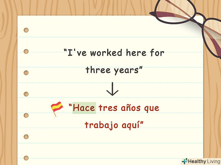 Використовуйте дієсловоhacer (а-сер) в загальноприйнятих виразах часу. дієслово hacer іспанською мовою означає робити або зробити, але якщо він йде в поєднанні зі словом que, він може використовуватися в якості виразу часу. Одне з основних застосувань цього дієслова в іспанській мові-це говорити про дії, які відбулися в минулому.[15]- Hacer + період часу + que (КЕ) + відмінювання дієслова в минулому часі описує дію, яке відбулося в певний момент в минулому. Наприклад, можна сказати: Hace tres años que empecé a trabajar aquí (я почав тут працювати три роки тому).