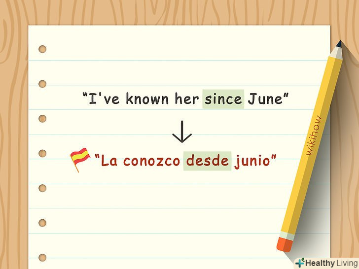 Використовуйте словоdesde як з (у значенні з тих пір). якщо ви хочете сказати, що щось відбувається з певного дня або дати, поставте слово desde перед датою або часом, як і в російській мові.[16]- Наприклад,La conozco desde junio означає:я знаю її з червня .