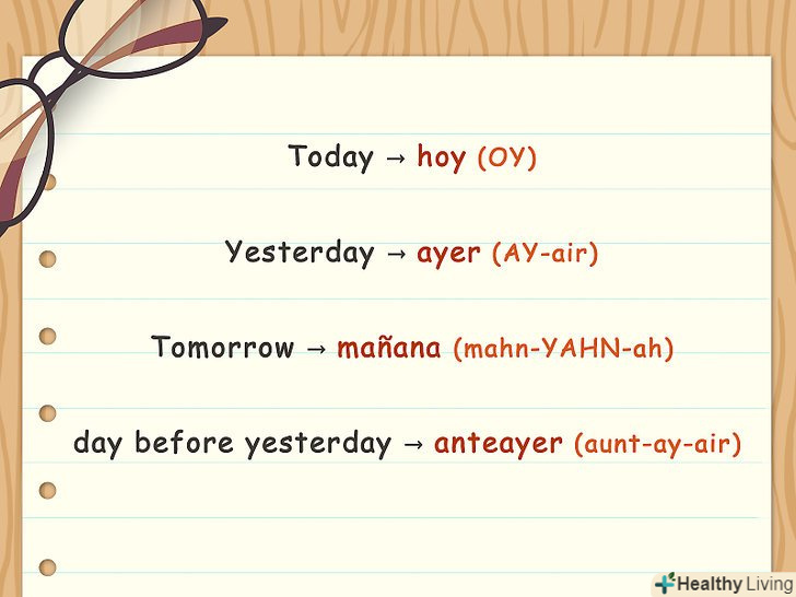 Вивчіть інші слова, щоб називати час.у повсякденній розмові іспанці зазвичай не використовують конкретні дати, щоб ознаменувати якусь подію. Ваша мова іспанською мовою буде звучати більш природно, якщо ви будете використовувати службові слова, такі як завтра або вчора.[17]- Сьогодні - hoy (ОЙ).