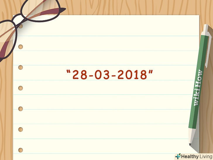 Скоротіть дату, повністю написавши її цифрами.як і в російській мові, тут існує скорочена версія дати, в якій використовуються тільки цифри. Але вона пишеться за тією ж формулою, що і повна версія: на першому місці день, а потім місяць і рік.[10]- Наприклад, якщо ви хочете вказати скорочену версію від28 березня 2018 року іспанською мовою, напишіть 28-3-2018 або 28-03-2018.