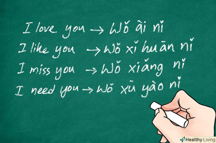 Ось чотири способи сказати» Я сумую за тобою " китайською мовою.[6]- Я люблю тебе: 我爱你 wǒ ài nǐ