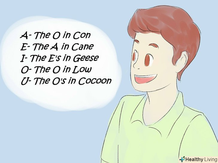 Голосні вимовляються наступним чином: Aa-як російська [а] в слові Машина, Ee-як російська [е] в слові Емаль, Ii-як російська [і] в слові мікро, Oo-як російська [о], тільки більш відкритий, Uu-як Російська [у]. На початку слова y вимовляється як [й], в кінці слова вона вимовляється як [і]. Існує пісенька для запам'ятовування голосних: А-E-I-O - U-El burro sabe más que tú (Ослик знає більше, ніж ви).