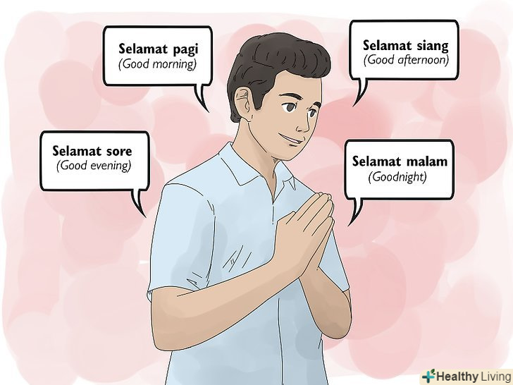 Привітайтеся індонезійською мовою (Bahasa Indonesian). Індонезійська мова є ще одним дуже поширеним мовою на Балі, так що чому б не вивчити кілька базових привітань і на цій мові? Найчастіше при зустрічі просто говорять" Halo "або"Hi". Також часто в якості привітання використовують фразу"Як справи?". Перекладається як: "Apa kabar?". Інші поширені привітання використовуються в залежності від часу доби.