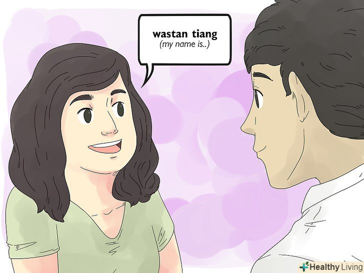 Представтеся.привітавши когось балійською мовою, Ви, можливо, захочете представитися. Для цього можна сказати "wastan tiang" і доповнити своїм ім'ям. Перекладається просто як " Мене звуть...". Після можна запитати ім'я свого співрозмовника:"sira pesengen ragane".[7]