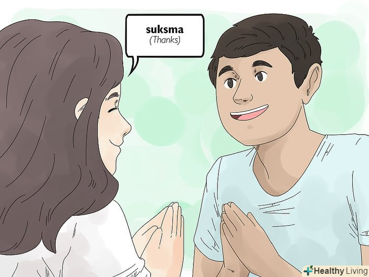 Подякуйте.якщо ви когось зупинили і попросили про допомогу або вказати напрямок, перед прощанням ви захочете тепло подякувати людині за його участь. Для цього можна сказати "suksma", що перекладається як"спасибі". [8]- У більш ввічливій формі це звучить як " terima kasih "("спасибі вам/тобі") або" matur suksma "("спасибі велике").[9]