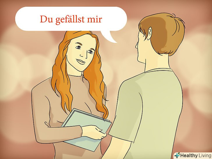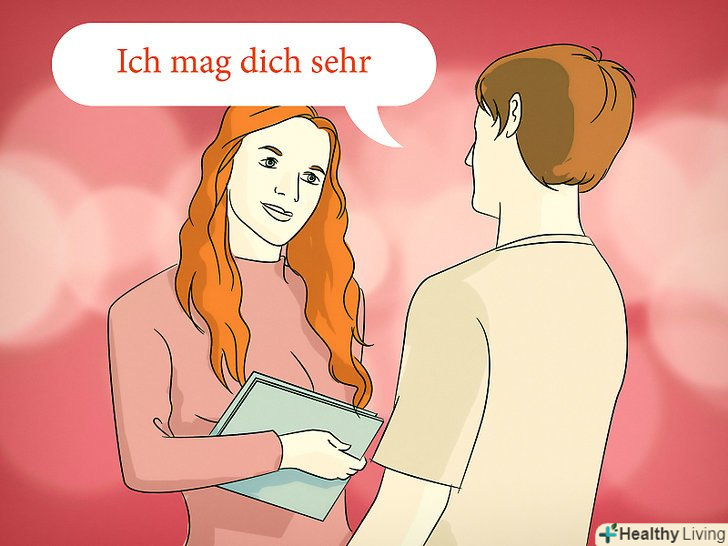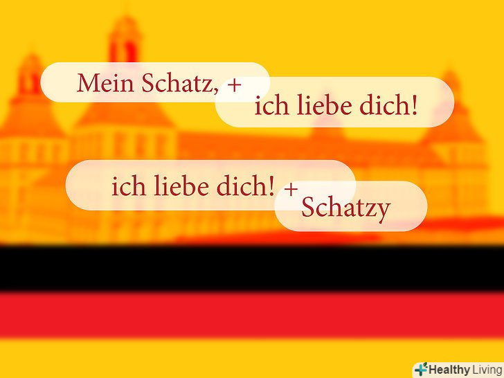 Додайте ласкаві слова.щоб зробити фразу тепліше, додайте туди приємне і ласкаве слово. Вистачить і одного, якщо що. Ось що можна сказати:- "Schatz", тобто "милий". Якщо ж перекладати буквально, то "скарб". Вимовляється як [ʃats]. Скажіть " Mein Schatz, ich liebe dich!"або" Ich liebe dich, Schatzy".